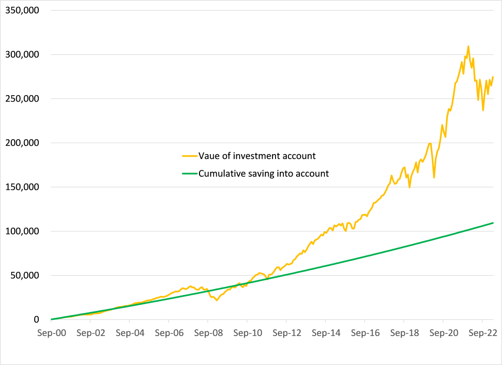 I made an example for you of someone who starts out saving $300/month in September 2000 and invests in an S&P 500 index fund. They increase that by 2.5% each year (they get a cost of living raise each January). Here is what their cumulative saving (the green line) and investment account value (the orange line) look like: