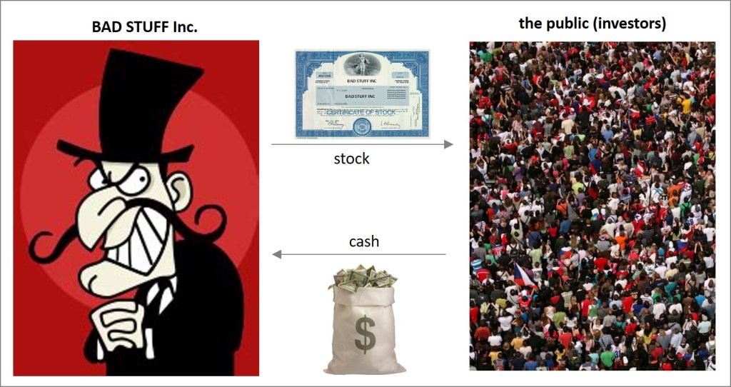 Here is a stylized description of how a company raises money from selling stock to the public: the company creates new shares of stock and in return gets a bunch of cash. Like this: