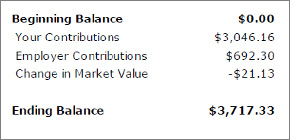 My beginning balance was $0. I put in a total of $3,046.16 during this multi-month period. My employer matched some of what I put in – they put in $692.30. All of this was invested in mutual funds when the money went into the 401k account, and during this period, those mutual funds went down in value by $21.13. Beginning balance of $0 + the $3,046.16 I put in + the $692.30 my employer put in – $21.13 drop in market value = ending balance of $3,717.33.