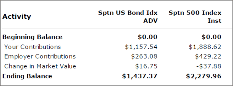 You can see the break down by mutual fund and across what I put in vs. what my employer put in. The bond fund gained a little bit during this period and the stock fund lost a little. Those gains and losses relate to my contributions and to the employer contributions because they were both invested in these same two mutual funds that changed in value.