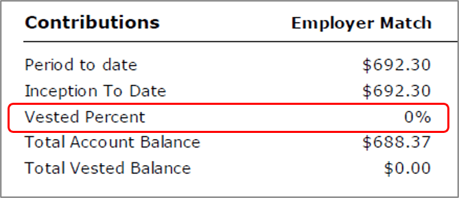 I’d had the job for less than a year at that point, so I was not vested in any of the employer contributions. That meant if I quit the job at that time, I would not actually get to keep $688.37 of what was in my 401k account (the employer contribution piece of it). I only would keep the part of the account related to my contributions.