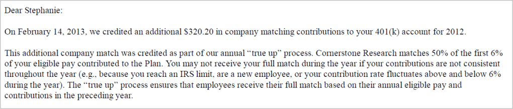 That’s how matching and vesting works. For those of you still reading, I will leave you with one last tiny boring detail on 401k matching. Matching happens with each paycheck, not all at once at the end of the year. So it is possible to end up in a situation where the employer match falls short of the amount you would calculate looking at your contributions for an entire year. This is a real email I received from a former employer: