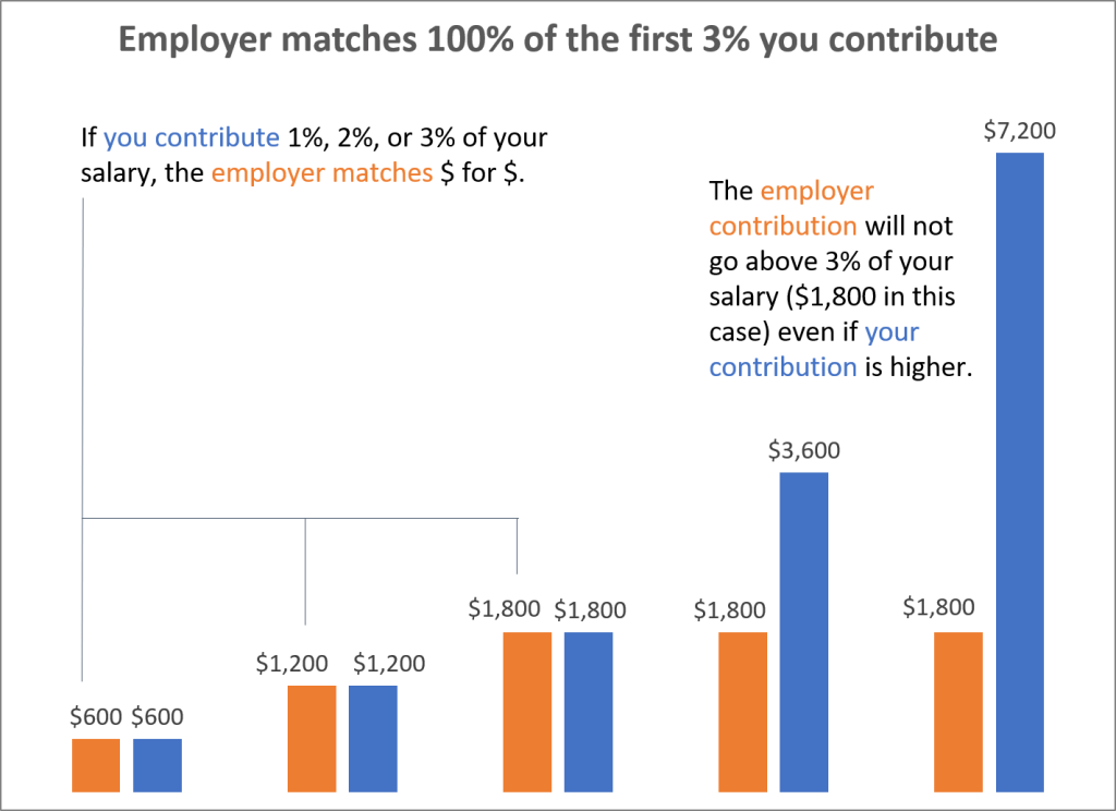 - For you, matching 3% of your salary means matching up to $1,800 for the year ($150/month). If you put in less, so will your employer. If you put in more, your employer will still only put in $1,800. Here’s a picture: