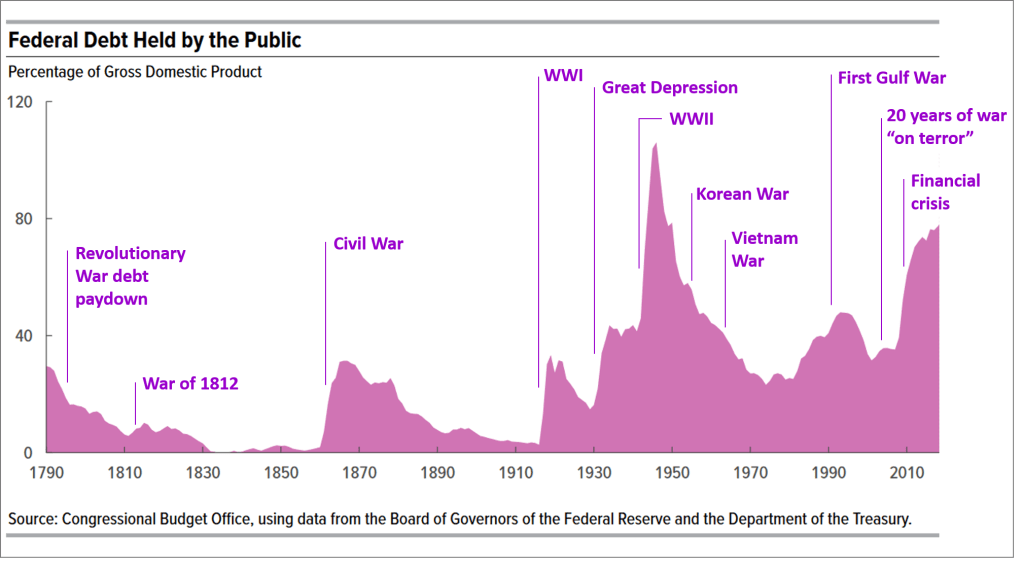 Here is a chart from the Congressional Budget Office showing U.S. federal debt over time (I added the purple labels):