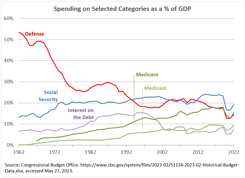 For my entire life interest on the debt and military (“defense”) spending have been among the top five categories of federal government spending, along with Social Security, Medicare, and Medicaid. Here is a chart showing these federal spending categories as a percentage of GDP: