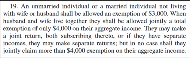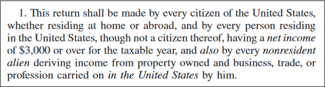 The tax law contemplated U.S. citizens living abroad and non-citizens living in the U.S. The 1913 Form 1040 uses he/him pronouns as “universal.” It does recognize that a wife could have income distinct from a husband: