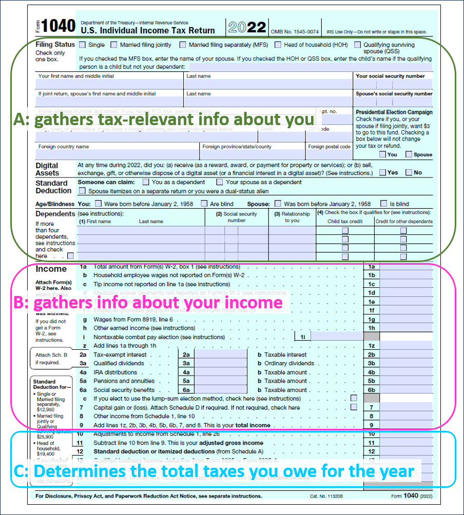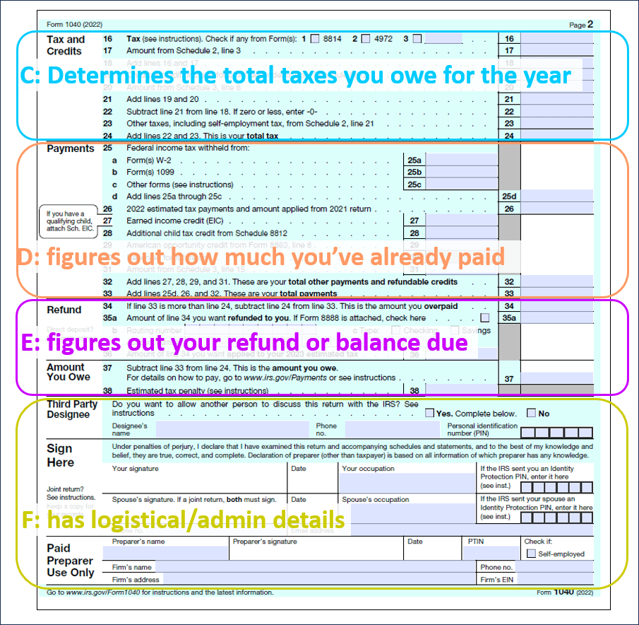 Which brings us to today’s 2-page beauty (not counting the 113-page instruction publication). There are lots of schedules and worksheets that are also part of the 1040, and we’ll get to some those later in the summer. We can think of a 1040 as having 6 areas which I’ll label A-F: [A] gathers tax-relevant info about you, [B] gathers info about your income, [C] determines the total taxes you owe for the year, [D] figures out how much you’ve already paid [E] figures out your refund or balance due, and [F] has logistical/admin details. You’ll see in the version I labeled below that [C] spans page 1 and page 2.
