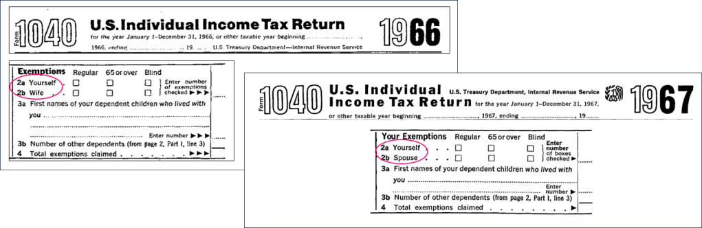 Each year, Form 1040 is updated to reflect changes in tax law. Sometimes the format, style, and language of the form is updated as well. For a married man and woman filing a joint tax return, until 1966 the IRS did not contemplate that the “wife” would fill out the form (thinking about my own marriage to a man…ha!). In 1967, the IRS vocabulary expanded to “spouse.”
