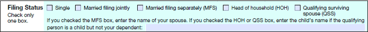 Looking back up to the top, the first thing Form 1040 asks about is “Filing Status.” There are 5 options to choose from: single, married filing jointly, married filing separately, head of household, and qualifying surviving spouse.