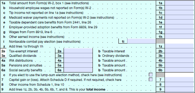 Lines 1-8, and their subparts, report your various types of income, and then line 9 adds it up to arrive at your “total income.” Know that if there is any kind of tax form you get in the mail summarizing income you received (actually, any tax form you get at all, income-related or otherwise), the IRS and your state tax authority also get a copy of that form.
