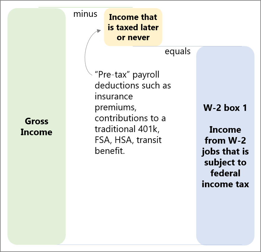 This amount may not be the same as the gross income you were paid (annual salary plus any bonuses/commissions). This is because any “pre-tax” money your employer takes out of your paycheck (e.g., health insurance premiums, contributions to a traditional 401k, transit benefit, etc.) is not subject to federal income taxes and will cause your gross income to differ from your taxable wages. Like this: