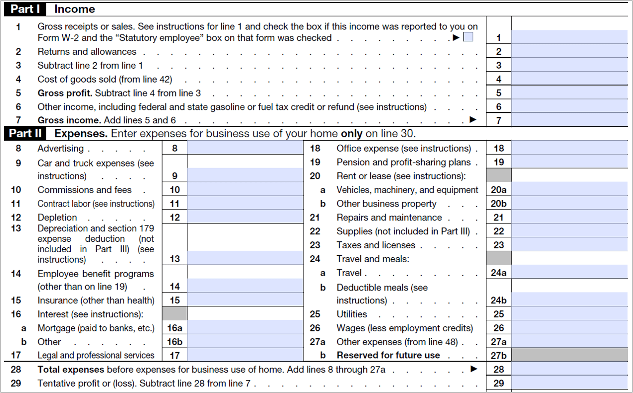Schedule C has a Part 1 section for Income and a Part 2 section for Expenses. They look like this: