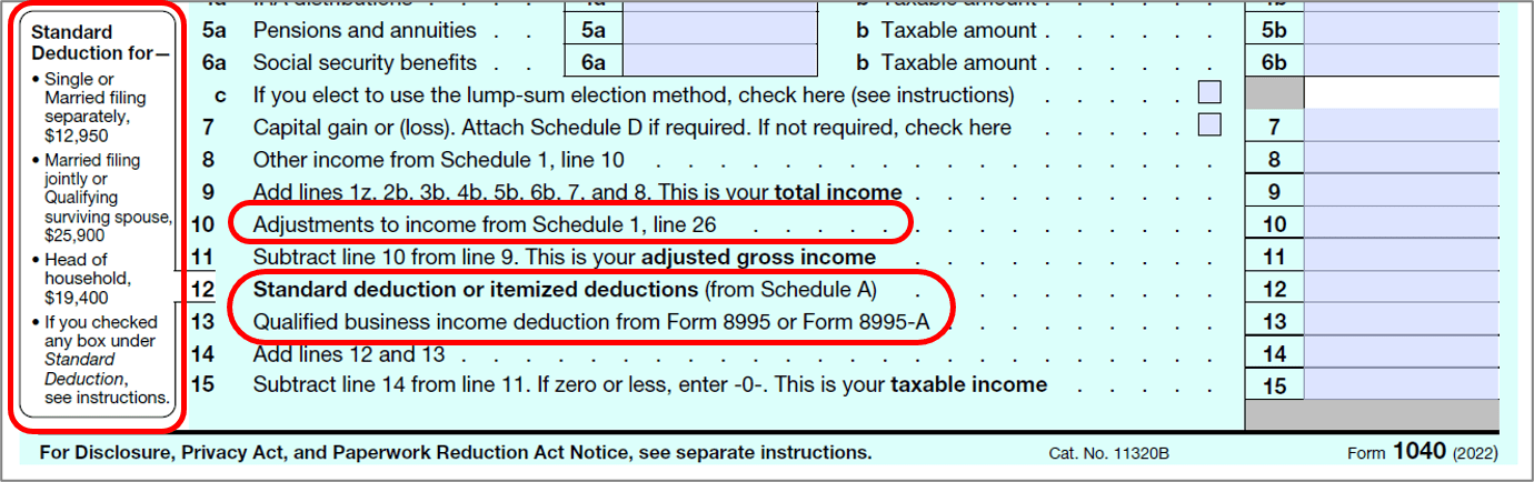 After you’ve “adjusted” your income, you then pick between the “standard deduction” or “itemized deductions.” The standard deduction is just a flat dollar amount corresponding to your filing status (in 2023, $12,950 for single/married filing separately, $25,900 for married filing jointly, $19,400 for head of household). Itemized is the sum of whatever “Schedule A deductions” apply to you.