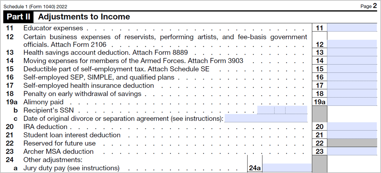 Line 10: What are these “adjustments”? Schedule 1, page 2 lays it out. Here I show the top part of the page with the more common ones: