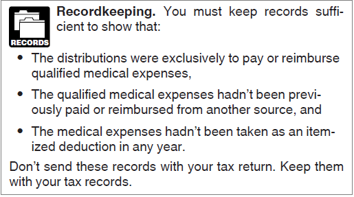 - #1: Records showing distributions were used to pay only for qualified medical expenses: An EOB (explanation of benefit) from your health insurance plan would be great backup. Itemized receipts that describe what the $ was spent on also work. The purpose of this is to only give tax benefits (discussed more below) for qualified expenses.