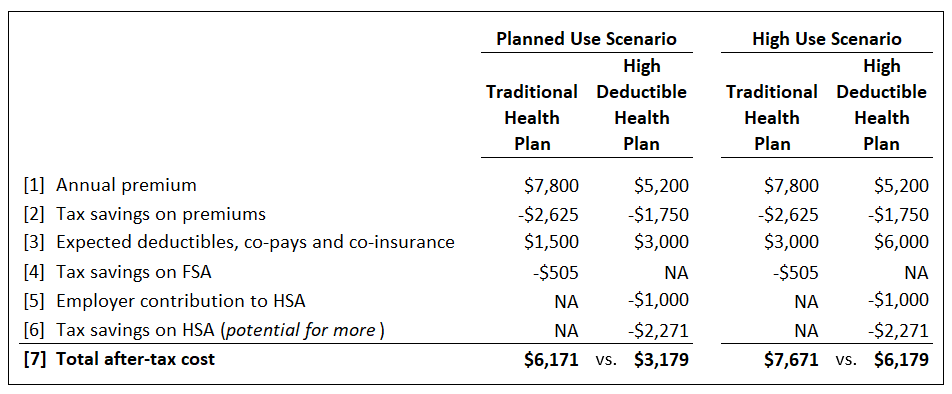 My approach is to consider the overall after-tax cost of each plan under consideration under (1) a “planned use” scenario and (2) a “high use” scenario. “Planned use” means doctor visits, scans, bloodwork, prescriptions, and everything else we know we’ll want during the year. “High use” covers anything extra that might come up.