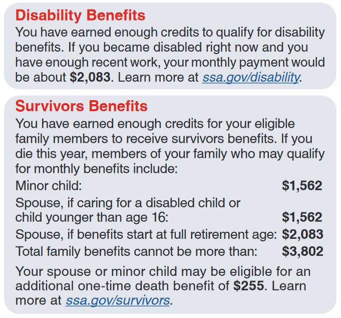 Before we tackle the fiction of our government’s accounting for Social Security, we need to touch on some other aspects of the program. The Social Security Administration doesn’t just send out monthly checks to older people. Take a look at your own Social Security statement (you’ve checked it on SSA.gov, right?) and on the first page, lower left, you’ll see something like this: