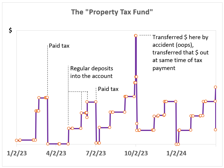 You can see the balance drops a lot each time we make a tax payment, and it bumps up each time we make one of our regular transfers into the account. This is my way of transforming our quarterly bill into a monthly bill, which is easier for me to work with, and I know there will always be enough in there to cover the bill when it comes due.