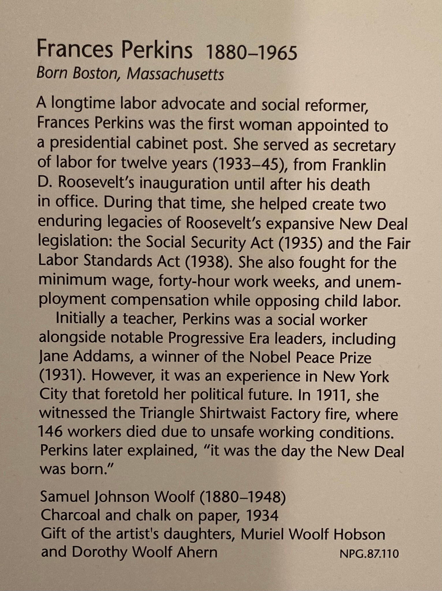We had a wonderful trip! We went to Washington D.C., and one of my favorite places we visited was the National Portrait Gallery. One of the portraits was of Francis Perkins, Secretary of Labor from 1933-1945: