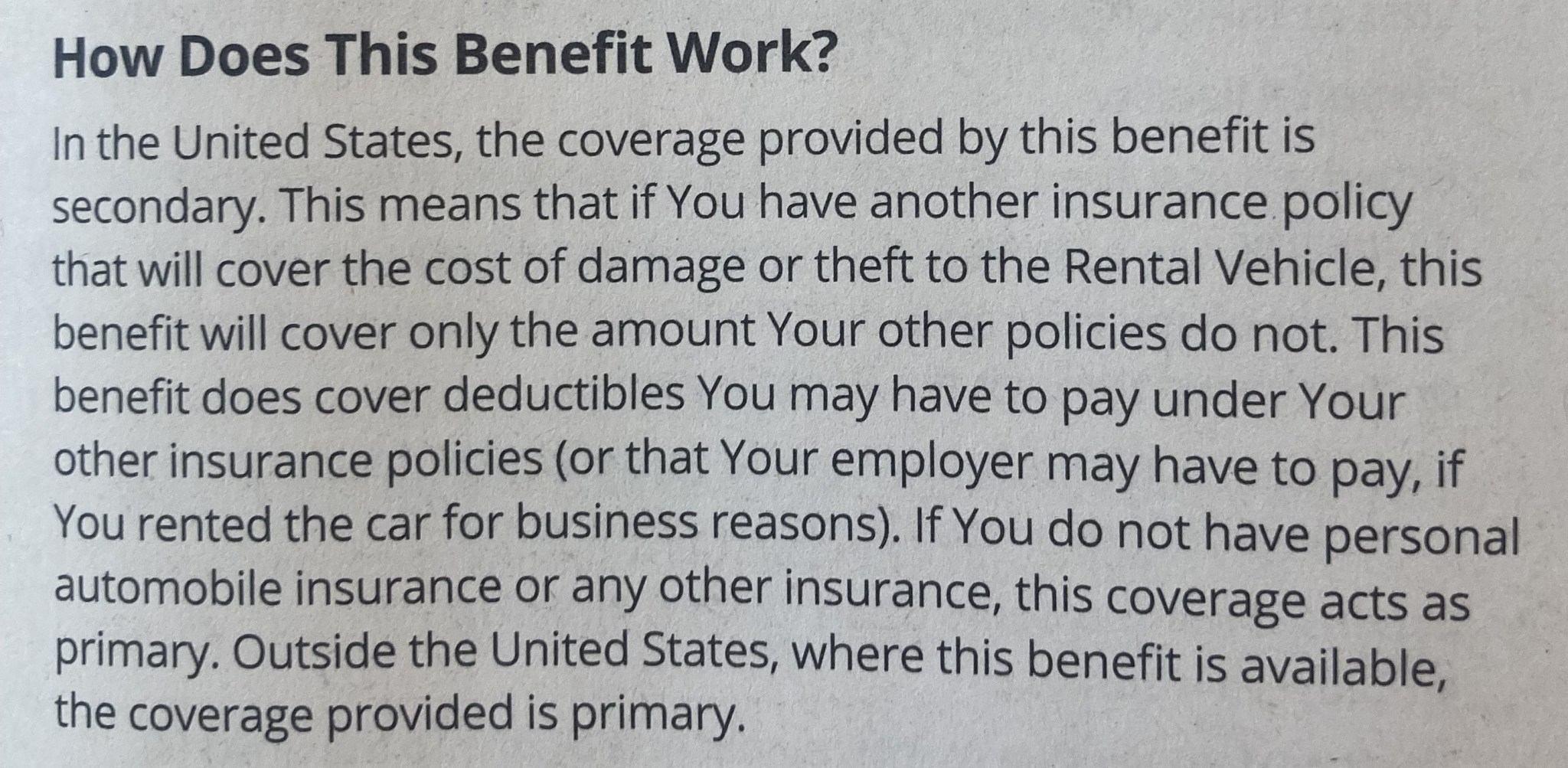 - Credit card coverage may be “secondary” meaning it kicks in after you’ve utilized other insurance you have, such as from a policy on a car that you own.