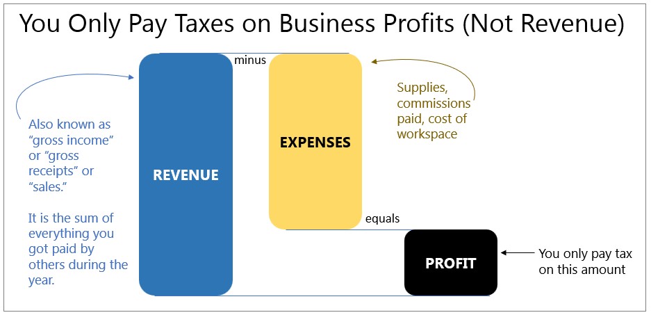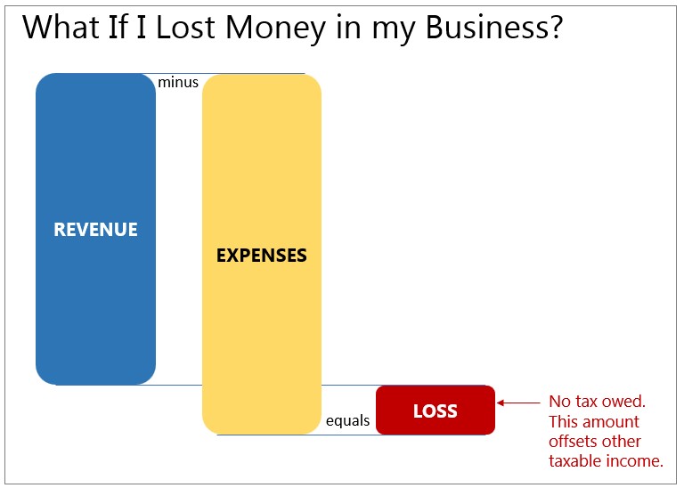 Difference #2 is whether losses can offset other taxable income. With a business, you can deduct expenses from your revenues, so you only owe tax on your profits. Like this: