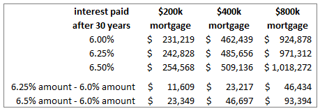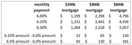 But let’s not talk in percents because what we actually pay is dollars. If you look at homes valued at $250k, $500k, and $1 million, assume someone puts 20% down, and has a 30-year fixed-rate mortgage, here are monthly payments at 6.0%, 6.25%, and 6.5%. This table only shows principal and interest, excluding property taxes and homeowners’ insurance, to give a clean comparison: