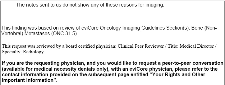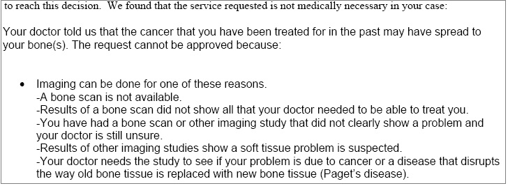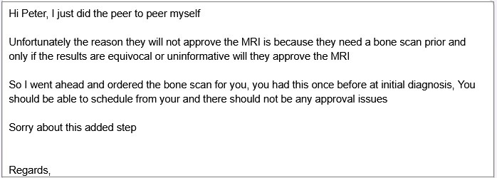 Very obviously Peter’s doctor had reviewed an “imaging studies” and was “still unsure” and Cigna knew it. But this letter lies even further. The real reason the MRI is denied because of what Peter’s endocrinologist said: Cigna requires a (less expensive) bone scan before they will approve the (more expensive) MRI. We are never going to get any Cigna documentation that states this.