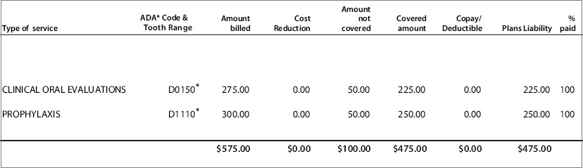 I went to the dentist and got an exam from the dentist (clinical oral evaluation) and a teeth cleaning (prophylaxis). For those two things, the dentist billed $575. Cigna only covered $475 of it and paid the dentist that amount. Therefore, I have used up $475 of my $2,000 allowance for the year. If the dentist takes x-rays, that also gets charged against my $2,000. My last x-rays, in September 2024, used up $300 of my insurance coverage.