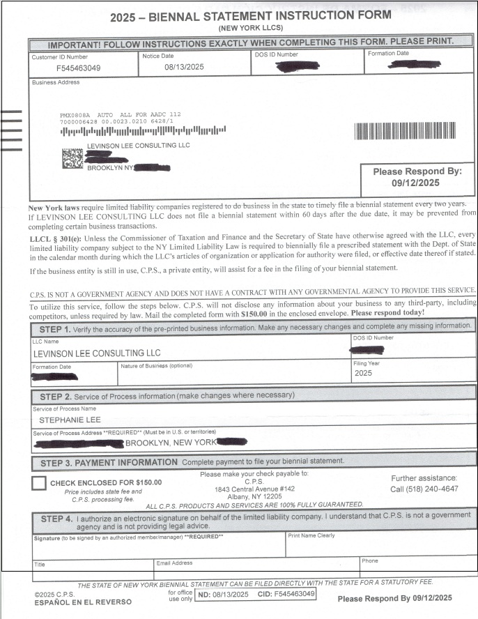 Last week my business received a letter (my official LLC name is Levinson Lee Consulting and my registered “doing business as” name is Frequently Taxed Questions). I opened the letter and thought, “oh yeah, that thing I have to file every other year with New York State.”
