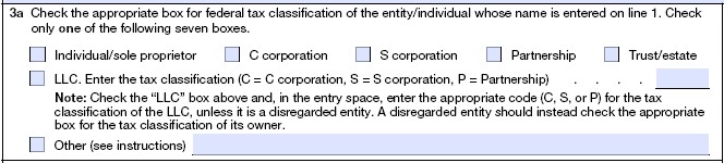 If you check the LLC box on the form, you also have to fill in tax status for C-Corp, S-Corp, or Partnership, or, if the tax status is sole proprietor, you don’t bother checking the LLC box at all, you just check the box for sole proprietor. An LLC is a legal entity that can take on different types of taxation.